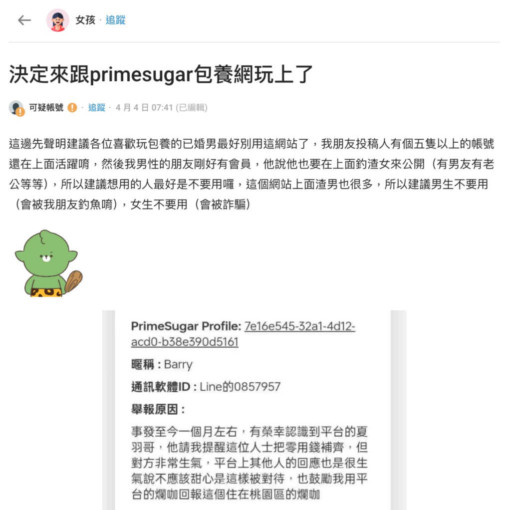 PrimeSugar 在 Dcard 上面討論蠻多的,一開始創辦人說不收取任何費用單純做一個平台讓大家交流,後來開始收取費用(不是重點),根據 Dcard 上面的討論,似乎有時候會遇到一些危險份子,因為這屬於個人行為,因此這邊只提供資訊參考,不做任何評斷