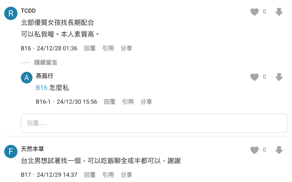 不少人直接在 Dcard 上面關於包養的相關文章中找,會在留言中留下「北部優質女孩找長期配合」「台北男想試著找一個」之類的留言,等女生、男生私訊